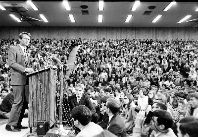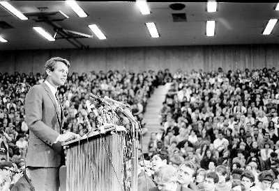 | Students, faculty and national media crowded into the Portland State University gym to hear Bobby speak of his plans for our country. |