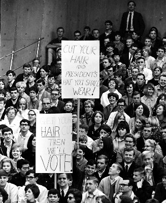 | Even with Bobby Kennedy, there were protests. Until I scanned these old negatives, I had forgotten about the "Cut Your Hair" anti-Bobby crusaders. |